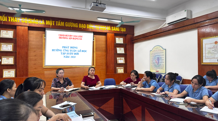 Cũng trong ngày đầu tuần, tập thể cán bộ giáo viên nhân viên đã hưởng ứng phong trào “Tuần lễ hưởng ứng học tập suốt đời” năm 2023 với chủ đề “Xây dựng năng lực tự học trong kỷ nguyên mới”.