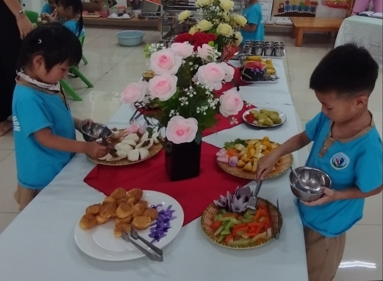 Trường MN Đặng Xá luôn chú trọng đến từng bữa ăn của trẻ, thực đơn được xây dựng phong phú, đảm bảo cung cấp đủ nhu cầu dinh dưỡng cho sự phát triển của trẻ. Bên cạnh món ăn ngon, đảm bảo VSATTP thì hứng thú trong bữa ăn cũng là điều được nhà trường rất quan tâm. Với hình thức ăn cơm thường đã quá quen thuộc với trẻ thì nhà trường cũng đã đưa thêm nhiều hình thức bữa ăn khác như ăn cơm khay, ăn cơm gia đình để nâng cao hứng thú giờ ăn cho trẻ. Đặc biệt trong năm học này nhà trường đã mạnh dạn đưa thêm hình thức ăn Buffet để làm phong phú thêm hình thức ăn cho trẻ. Với hình thức ăn Buffet trẻ hứng thú với bữa ăn hơn, được thưởng thức nhiều món ăn hơn, được tự do chọn những món ăn mình thích, các món ăn cũng được các cô trang trí đẹp mắt. Với giờ ăn buffet trẻ học được cách dùng kẹp để gắp thức ăn, được học những quy tắc khi đi ăn buffet. Hình thức ăn buffet tại lơp MG nhỡ B2 luôn là sự hào hứng mong chờ của các con trong lớp, Những trải nghiệm thú vị của con ở lớp để kể với bố mẹ.