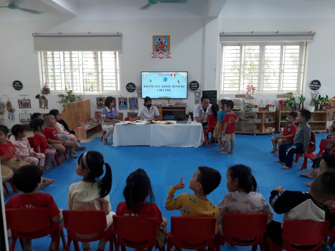 Khám sức khoẻ định kỳ cho các cháu là hết sức thiết thực và ý nghĩa thông qua việc khám sức khỏe định kỳ cho trẻ đã góp phần không nhỏ vào việc nâng cao nhận thức cho phụ huynh về ý thức phòng chống một số bệnh thường gặp ở lứa tuổi mầm non và cũng qua hoạt động này đã đem lại sự phấn khởi, tin tưởng trong các bậc phụ huynh về một môi trường giáo dục an toàn và thân thiện. Sau đây là 1 số hình ảnh của các bé lớp B1 trong buổi khám sức khỏe.