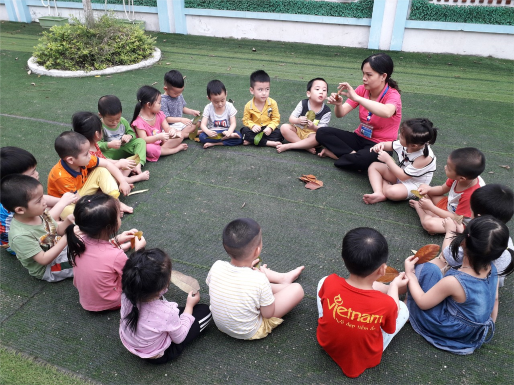 Trong khi chơi ngoài trời, các con còn học được kỹ năng hoạt động nhóm, mỗi nhóm cô đưa ra một yêu cầu khác nhau tùy theo trình độ của mình rồi tập thuyết trình. Trẻ sẽ tự phân công xem ai là nhóm trưởng, ai sẽ phụ trách việc tổng hợp ý kiến rồi trình bày ý tưởng…Tất cả những việc đó tưởng chừng đơn giản nhưng không, đây là những tiền đề để các con tích lũy vốn hiểu biết và kinh nghiệm cho những bài học sau này, và quan trọng hơn nó là sự gắn kết hòa đồng giữa một tập thể lớp mà các con đang học.